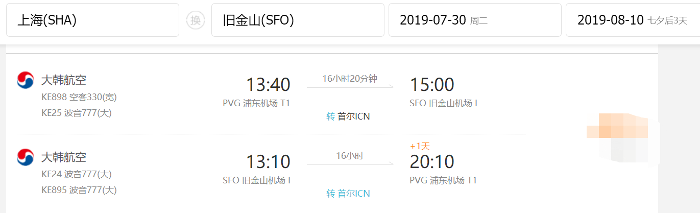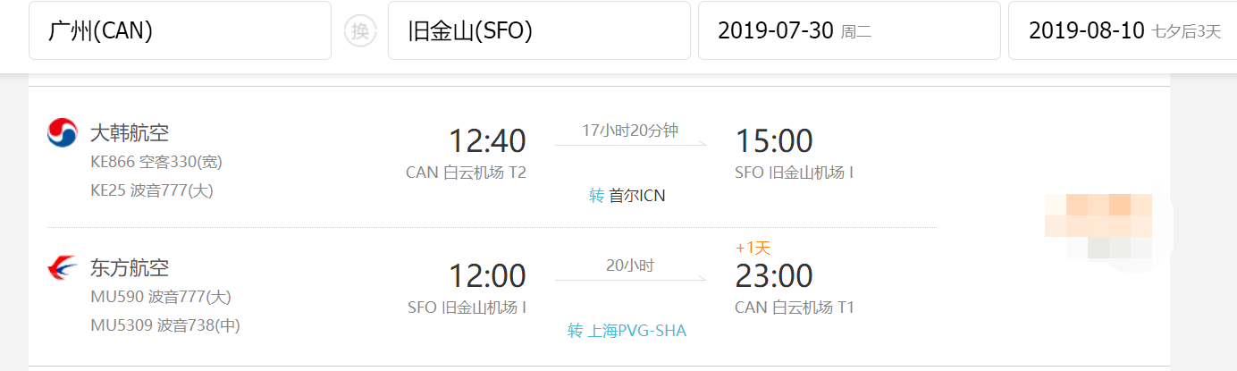 - 航班号MU590, 东方航空,旧金山国际机场 (12:00) -> 上海浦东国际机场 (16:30 + 1天)