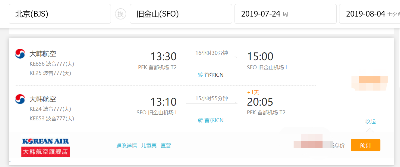 - 直飞航段,航班号MU590, 东方航空,旧金山国际机场 (12:00) -> 上海浦东国际机场 (16:30 + 1天)