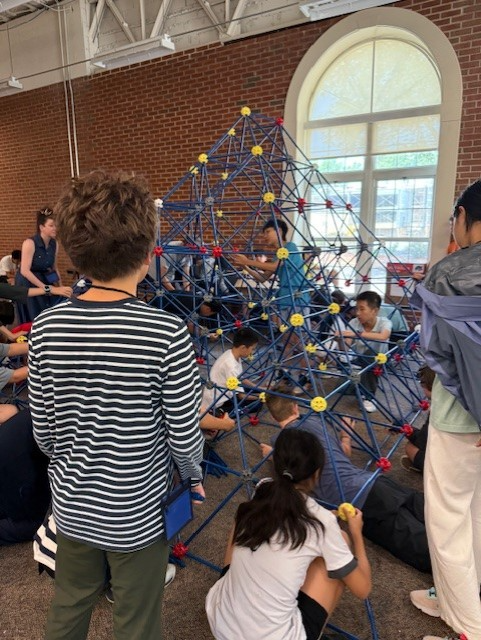 After explaining The Game of Life, Glen gave our participants the choice of three different models to build based on The Game of Life,. We held a voice vote among choices A, B, and C, and choice A, a pyramid shaped structure, won. This afternoon students built a pipe-and-joint visualization of a 10-generation life cycle of one cell grid. Each layer of the construction represented a generation of cells, and by viewing the finished project from top to bottom one could see the way the cells would multiply, spread, and eventually disappear. It was quite a challenge, but the students handled it beautifully. The finished piece was very impressive!