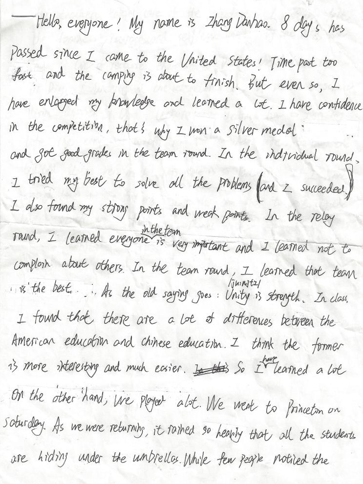 Hello, everyone! My name is Zhang Danhao. 8 days has passed since I came to the United States! Time past too fast and the camping is about to finish. But even so, I have enlarged my knowledge and learned a lot. I have confidence in the competition, that’s why I won a silver medal and got good grades in the team round. In the individual round, I tried my best to solve all the problems and I succeeded. I also found my strong points and weak points. In the relay round, I learned everyone in the team is very important and I learned not to complain about others. In the team round, I learned that team is the best. As the old saying goes: Unity is strength. In class I found that there are a lot of differences between the American education and Chinese education. I think the former is more interesting and much easier. So I have learned a lot. On the other hand, we played a lot. We went to Princeton on Saturday. As we were returning, it rained so heavily that all the students are hiding under the umbrellas. While few people noticed the teachers taking care of the students. I deeply felt the teachers courage and selfless spirit. By the way, we had a lot of lectures these days. During the lecture by Dr. Ding, I understood the development of medical science. During another Dr. Ding’s lecture, I learned how to face my life. The camp will benefit me for my whole. Life, I love the United States very much. This place is so fantastic. If I have enough time in the future, I might come back to visit the United States again. That’s all. Thanks a lot.