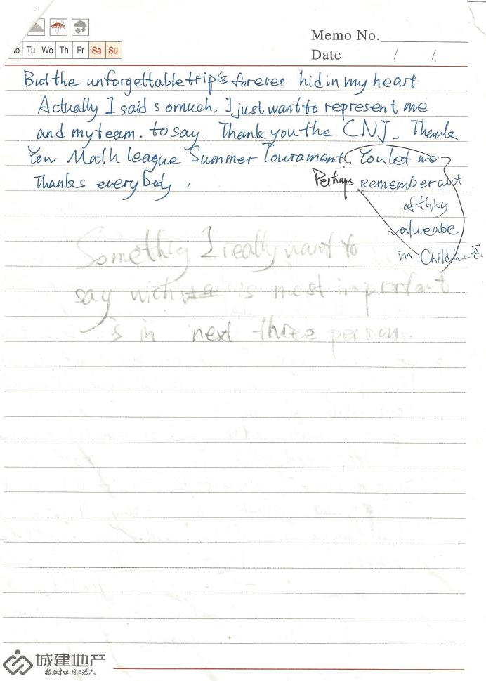 Eventually, at the group finals, my mates of group Gray and I got the gold medal of the Grade 6-7. Personally, I got the award for superior achievement. My efforts were rewarded, which made me very excited. On the following days, I was totally into the world of Math. The teaching style of professors here is always active and full of fun, brings the boring knowledge into life. And I have to say all the surroundings are so adorable, the campus is full of green and fresh air, the dorm is neat and clean and the teachers and staff are all conscientious and caring. That helps a lot, I really appreciate that.