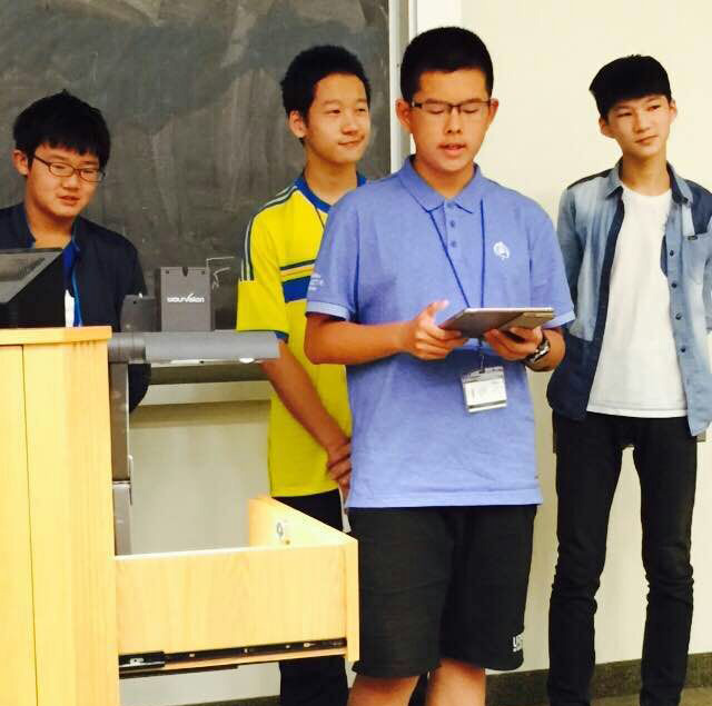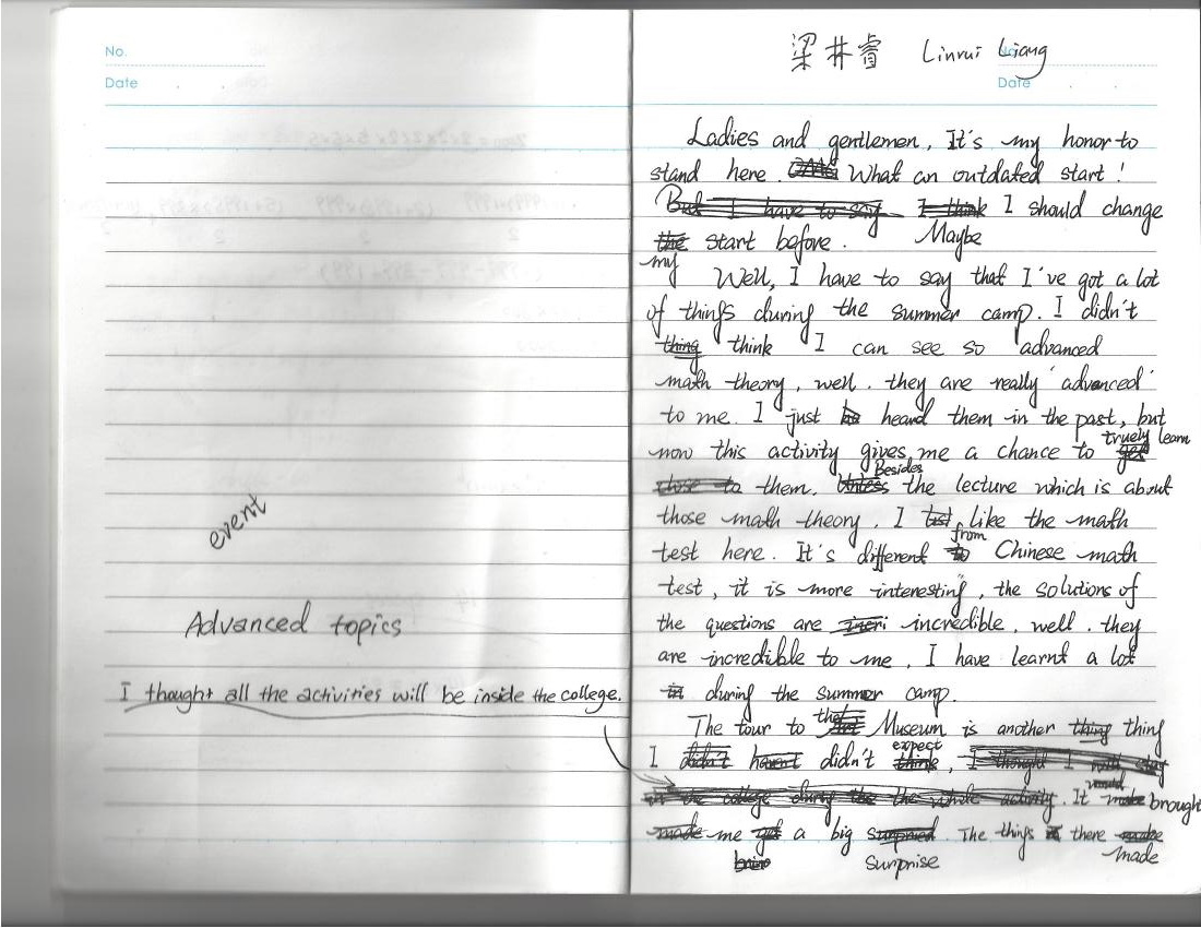 Well, I have to say that I’ve got a lot of things during the summer camp. I didn’t think I can see so advanced math theory, well. They are really advanced to me. I just heard them in the past, but now this activity gives me a chance to truly learn them. Besides the lecture which is about those math theory, I like the math test here. It’s different from Chinese math test, it is more interesting, the solutions of the questions are incredible, well, they are incredible to me. I have learnt a lot during the summer camp.