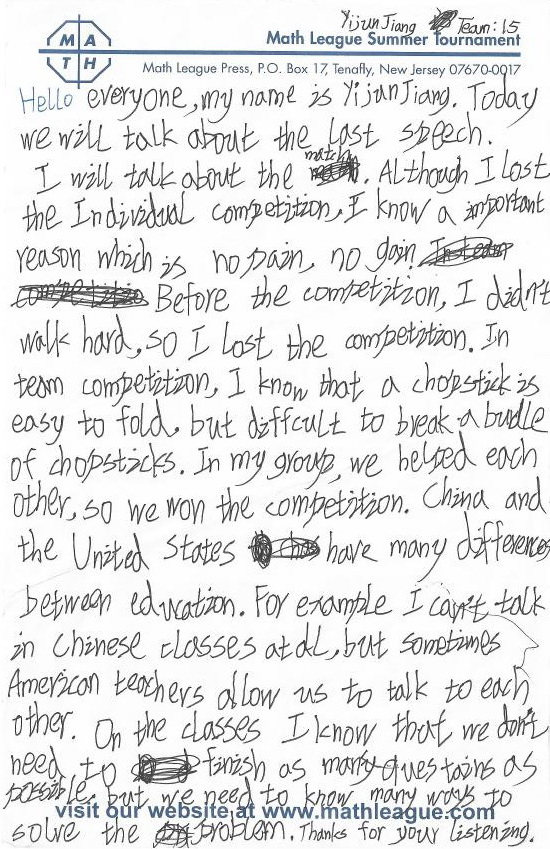 Before I come here, I talked to my mother. I asked her:”Why do you want me go to the Math League. I’m not good at English?”