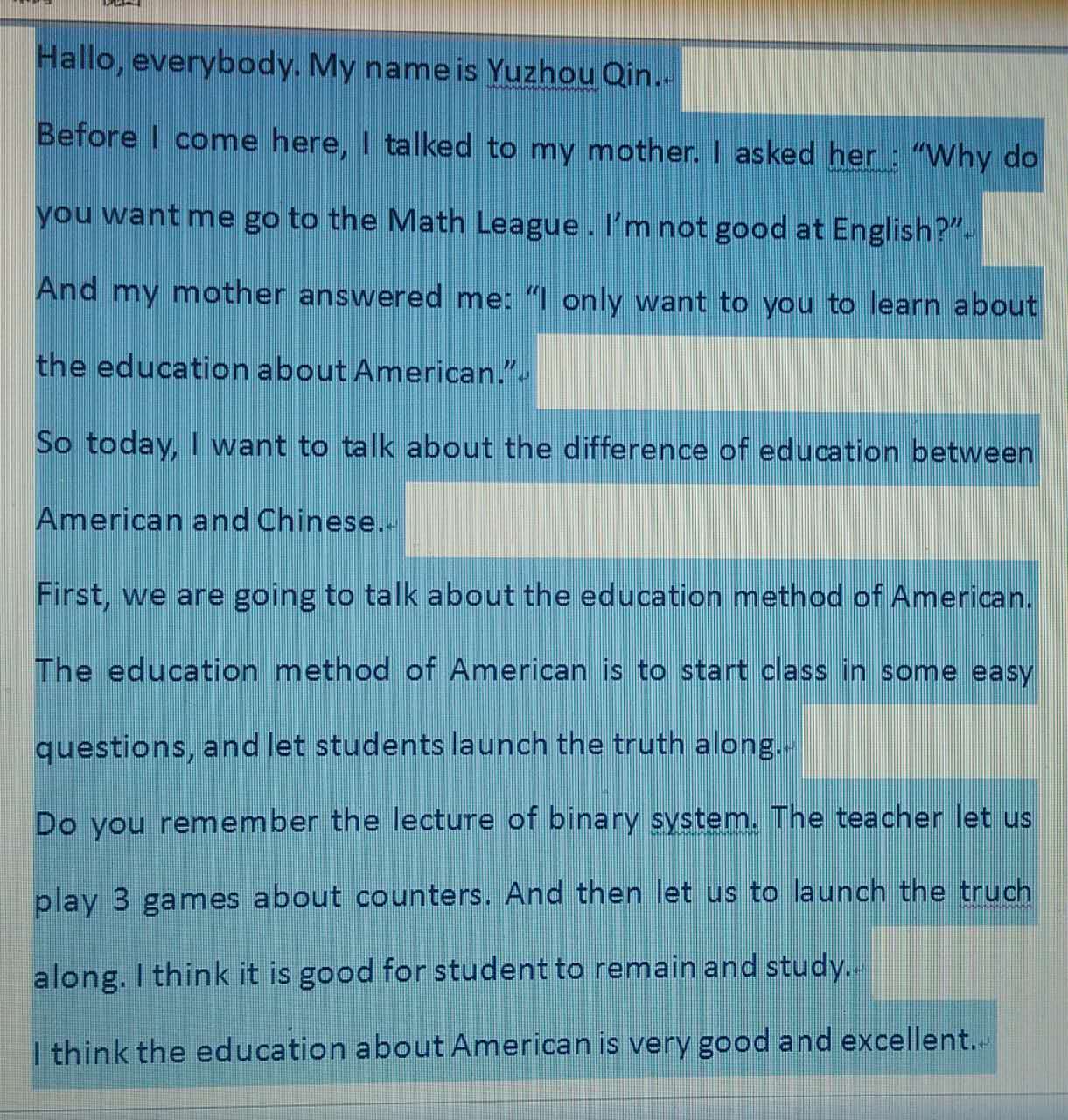 Hello everyone, my name is Yijun Jiang. Today we will talk about the last speech. I will talk about the math. Although I lost the individual competition, I know a important reason which is no pain, no gain. Before the competition, I didn’t walk hard, so I lost the competition. In team competition, I know that a chopstick is easy to fold, but difficult to break a bundle of chopsticks. In my group, we helped each other, so we won the competition. China and the United States have many differences between education. For example I can’t talk in Chinese classes at all, but sometimes American teachers allow us to talk to each other. On the classes I know that we don’t heed to finish as many questions as possible, but we need to know many ways to solve the problem. Thanks for your listening.