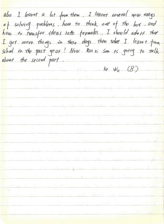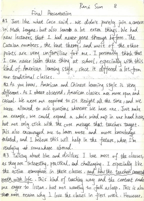 #1: Just like what Coco said, we didn’t purely join a contest in Math League, but also learnt a lot extra things. We had new lectures that I had never gone through before. The Catalan numbers, the knot theory, and most of the other points are very unfamiliar for me. I personally think that I can never learn these thing at school, especially with this kind of American learning style, since it differed a lot from our traditional classes.