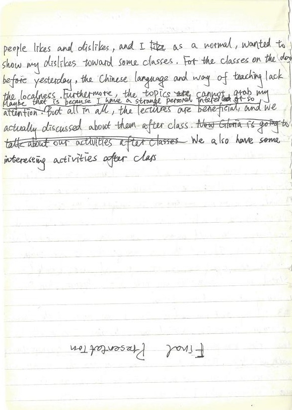 #3: Talking about like and dislikes. I love most of the classes, as they are interesting, practical, and challenging. I especially like the active atmosphere in these classes, and how the teachers connected math with life. This kind of teaching way and the content made me eager to listen, but not wanting to fall asleep. This is also we main reason why I love the classes in first week. However, people likes and dislikes, and I as a normal, wanted to show my dislikes toward some classes. For the classes on the before yesterday, the Chinese language and way of teaching lack the localness. Further mote, the topics cannot grab my attention. Maybe that is because I have a strange personal interest. But all in all, the lectures are beneficial, and we actually discussed about them after class. We also have some interesting activities after class.