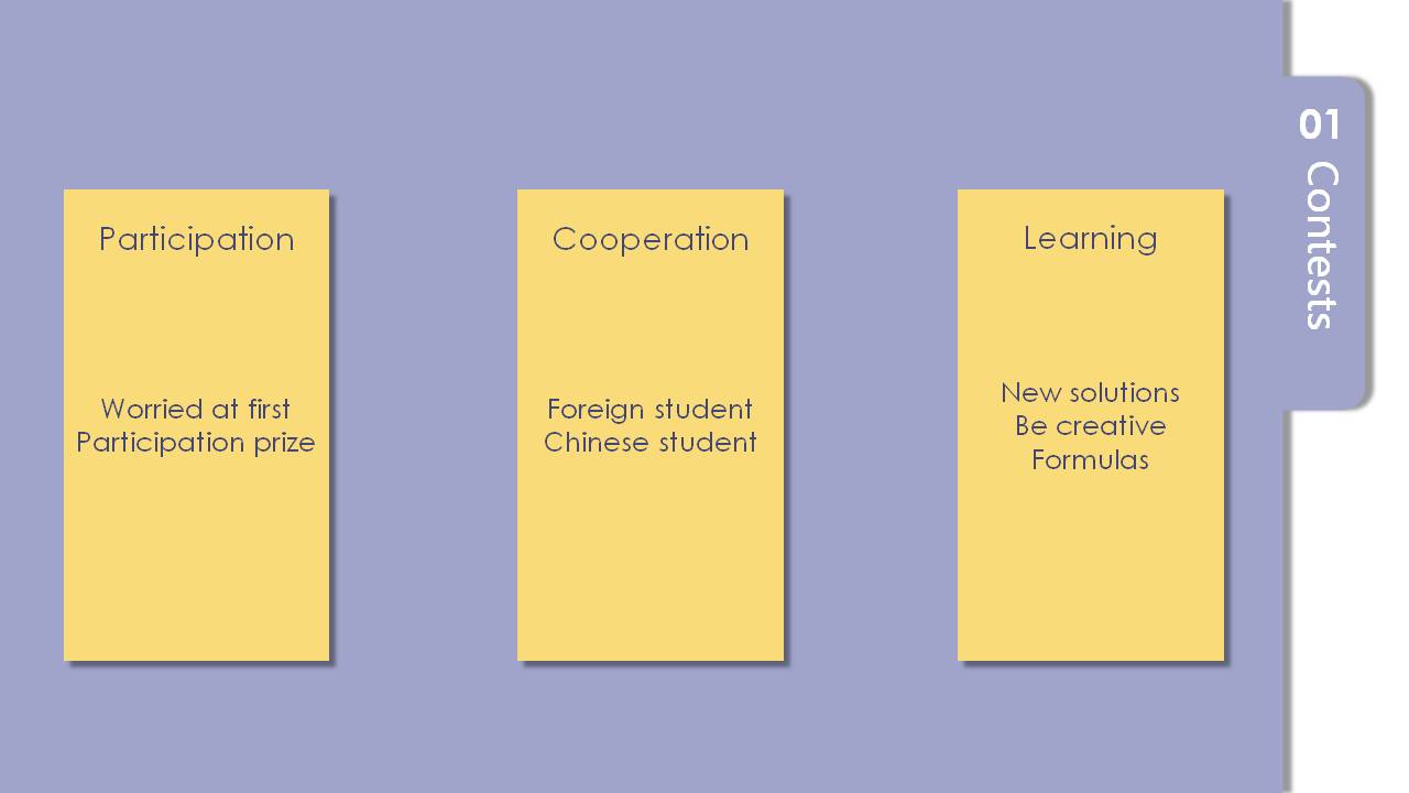 The Math League, obviously is a competition, which select a winner among all the candidates. Before I came here, I was a luays worming about myself since I wasn’t really good at math. But to my surprise, the most important thing of the Math League is to learn through the process, and they gave a certification to everyone who participated in. That truly gave me the courage to keep going and helped me understood how natal participation is. Talking about what I did and what I learnt during the process. There are mainly four rounds: individual, relay, team and speed. The two personal rounds. Individual and speed are somehow difficult for me, but I believe they are really easy for some people. Therefore I decided to put more effort on the relay and team round. During these two rounds, my group members communicated with foreign students fluently, as well as talking with Chinese students around. I also join the group discussion, but I didn’t spoke to foreign students much, due to the fact that I’m a bit shy and I have the fear of not understanding what they said. But in the end, the result came out to be nice, and I believe it was because of the effectiveness of our communication. So here I want to thank those in my team who shared their passion with foreign students. Moreover, not only enjoy the process of cooperating with my group members, but also I learnt a lot from them. I learnt several new ways of solving problems, have to think out of the box, and how to transfer ideas into formulas. I should admit that I got more things in these days than what I learnt from school in the past year! Now Ranxi Sun is going to talk about the second part.