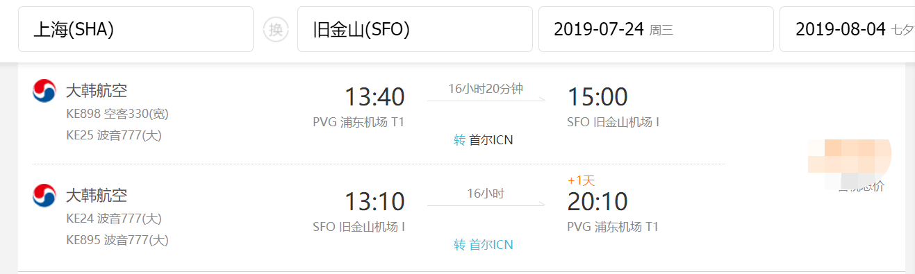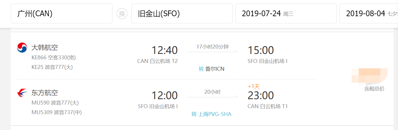 - 航班号MU590, 东方航空,旧金山国际机场 (12:00) -> 上海浦东国际机场 (16:30 + 1天)