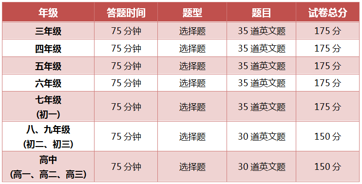 - 七年级(初一)的数学试题是35道选择题,总分175分, 答题时间为75分钟。所有题目为英文原题。考试时组委会给每个学生提供在线数学常用词汇表(英汉对照)。禁止使用任何字典、词典、计算器、及任何资料(包括纸质及电子版的)。