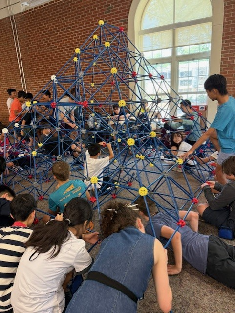 After explaining The Game of Life, Glen gave our participants the choice of three different models to build based on The Game of Life,. We held a voice vote among choices A, B, and C, and choice A, a pyramid shaped structure, won. This afternoon students built a pipe-and-joint visualization of a 10-generation life cycle of one cell grid. Each layer of the construction represented a generation of cells, and by viewing the finished project from top to bottom one could see the way the cells would multiply, spread, and eventually disappear. It was quite a challenge, but the students handled it beautifully. The finished piece was very impressive!