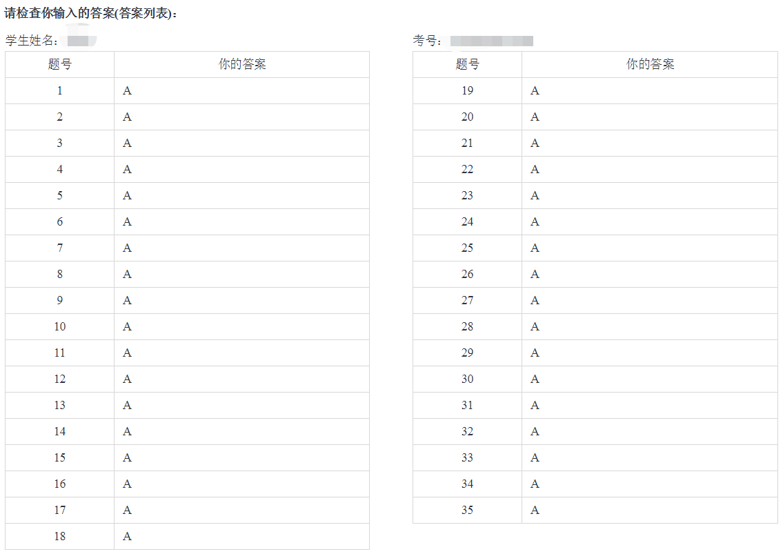 - Before submitting their answers, the system will display the student's answer list on the computer screen